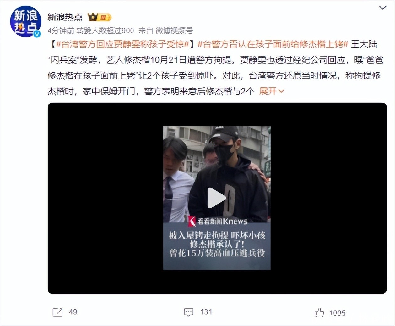资料参考:新浪热点|台湾警方回应贾静雯称孩子受惊 新浪微博|修杰楷发文致歉